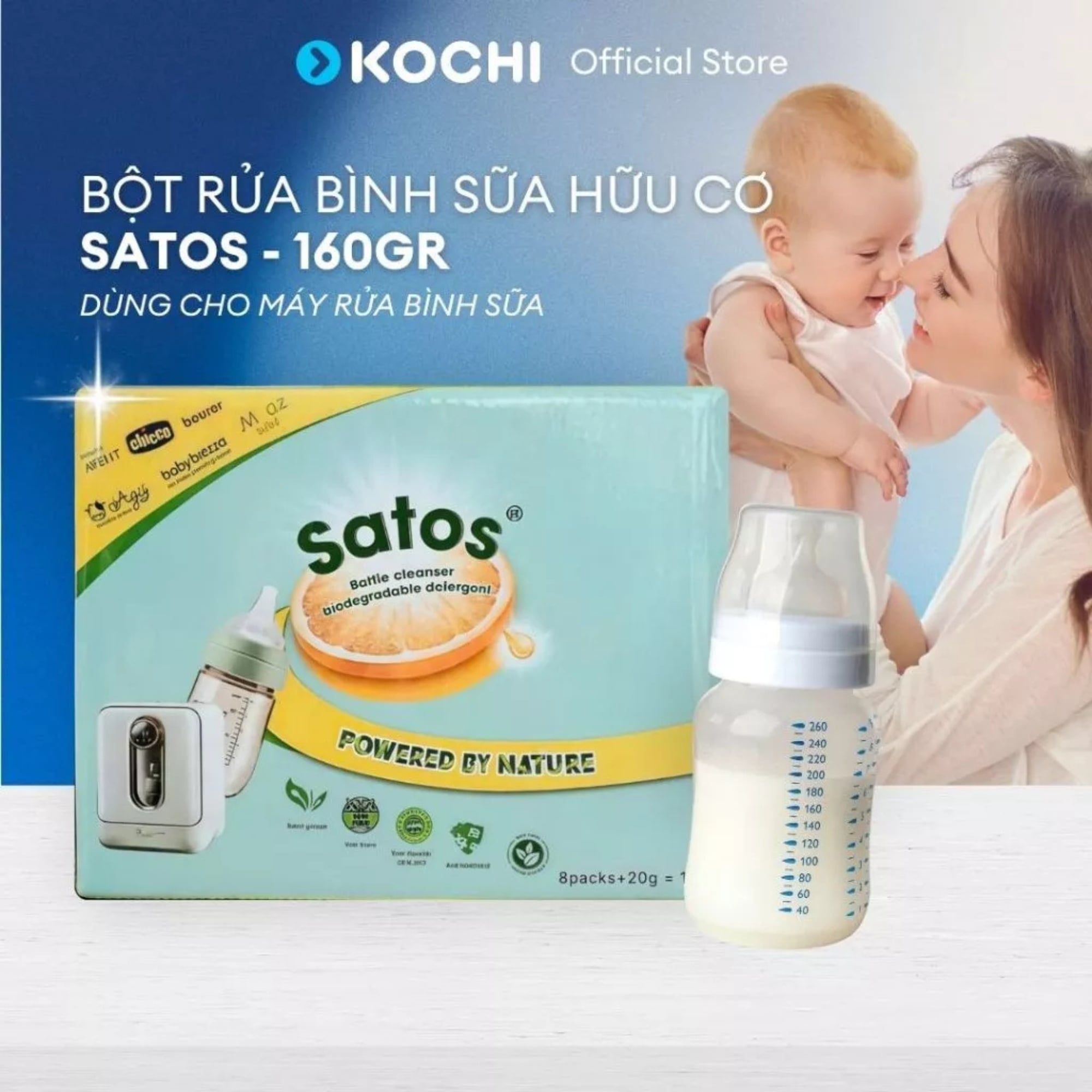 Bột rửa bình sữa Satos 160gr - Dành cho máy rửa bình sữa - Hữu Cơ - 100% tự nhiên - Không hoá chất - Mùi nhẹ - Sạch Sâu